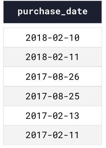 Dataiku then uses this pattern to dispatch the dataset’s underlying files across the appropriate partitions. For example, let’s say our dataset contains the following rows and we’ve asked Dataiku to partition by “Day” of purchase_date using the pattern %Y-%M-%D/.*: