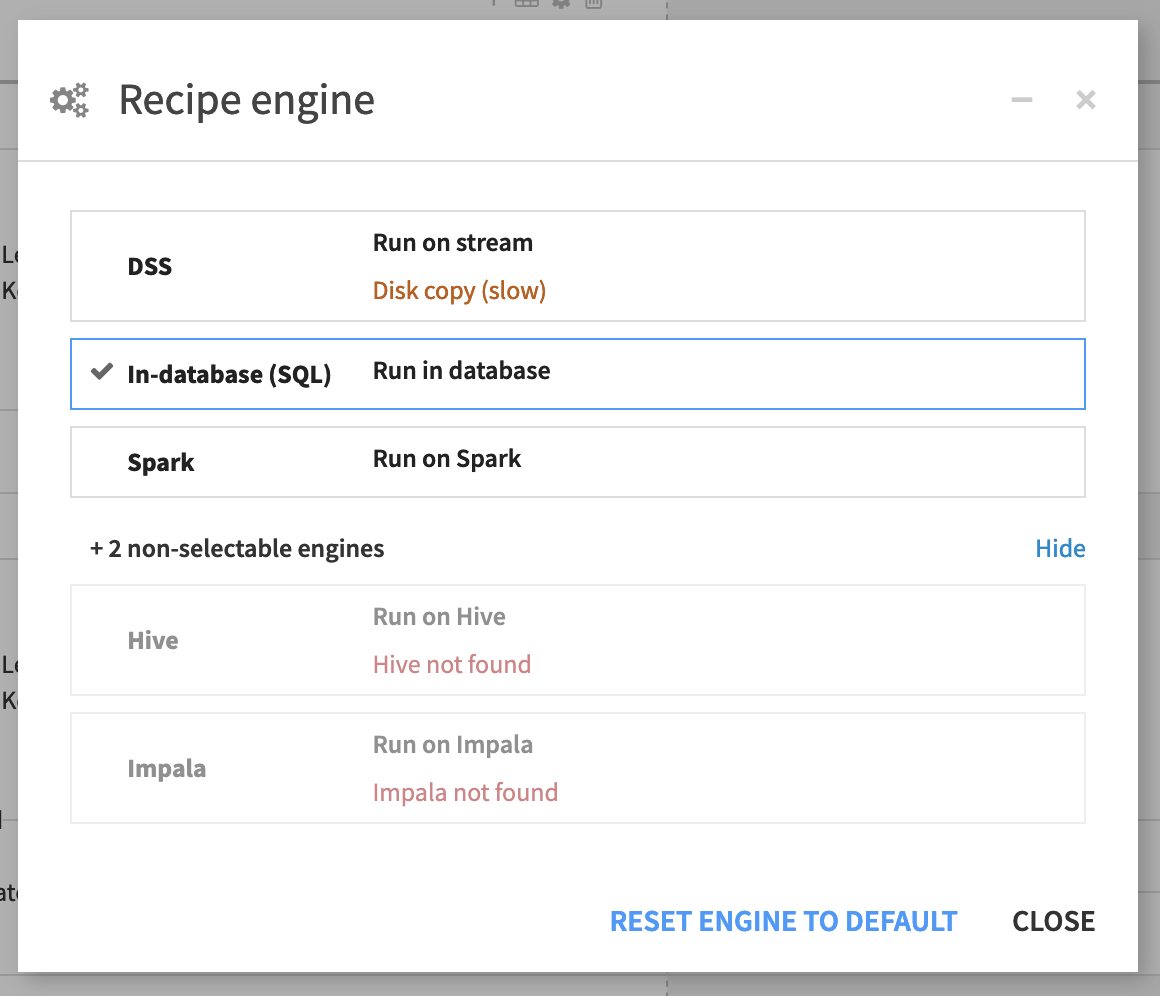 Beneath the Run button within the Settings tab of every visual recipe is the recipe engine setting. Available engines depend on the instance’s architecture.#