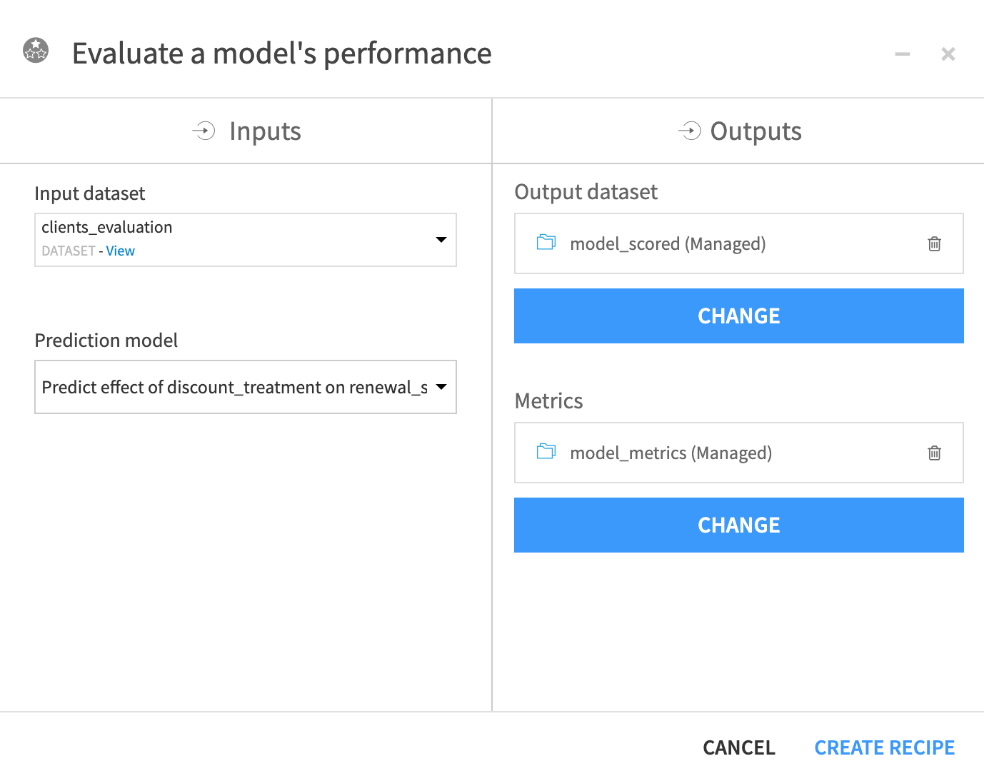 The Evaluate recipe generates two output datasets.