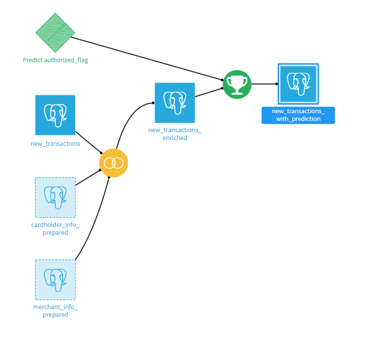 The most visible change is that we removed the data processing on the cardholder and merchant datasets. We switched to using the feature groups instead, as shared datasets (appearing black in the Flow). Since the schema is the same, this change was pretty straightforward.