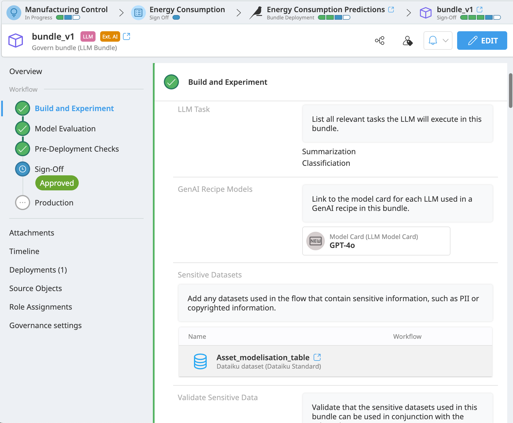Finally, this Solution optionally provides a custom bundle template for projects that use LLMs. When governing a new bundle, you can select the LLM Bundle template from the dropdown. This template includes a series of workflow steps to assess core questions on security, data privacy, fairness, and overall evaluation metrics related to the use of an LLM within the bundle itself.